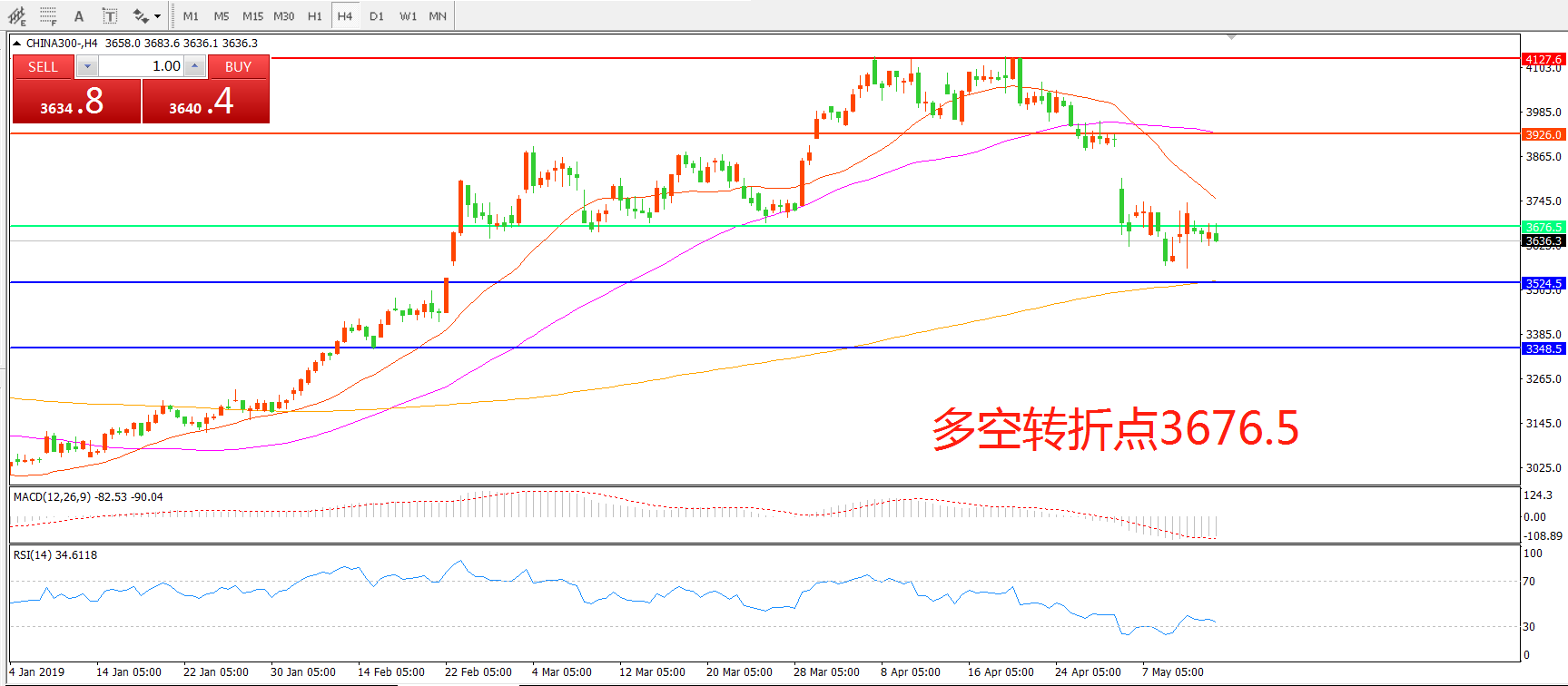 交易策略:在3676.50之下看跌,目标3524.50     3348.50