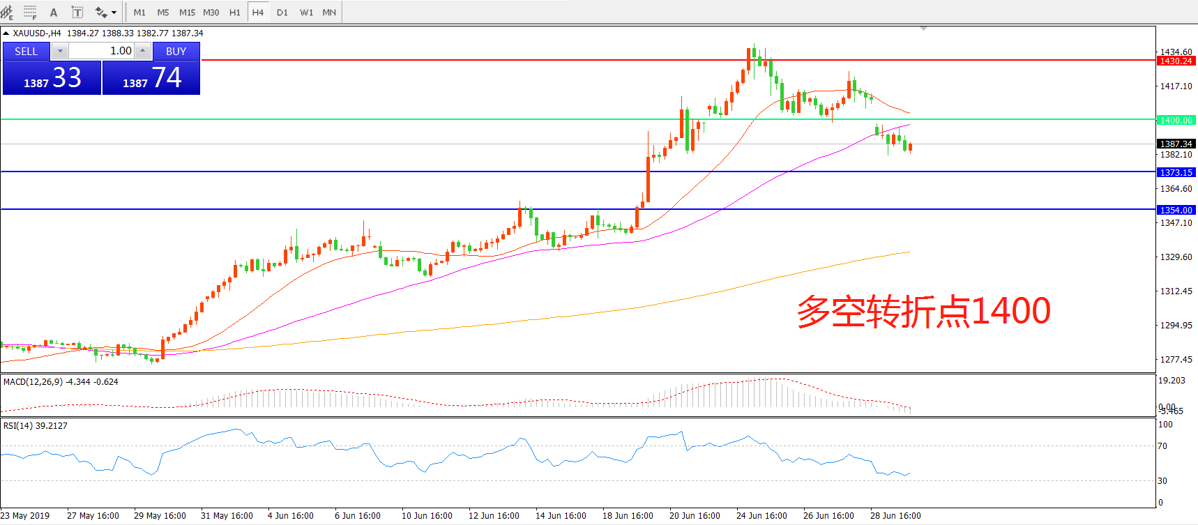 交易策略:在1400.00之下看跌,目标1373.00 1354.00
