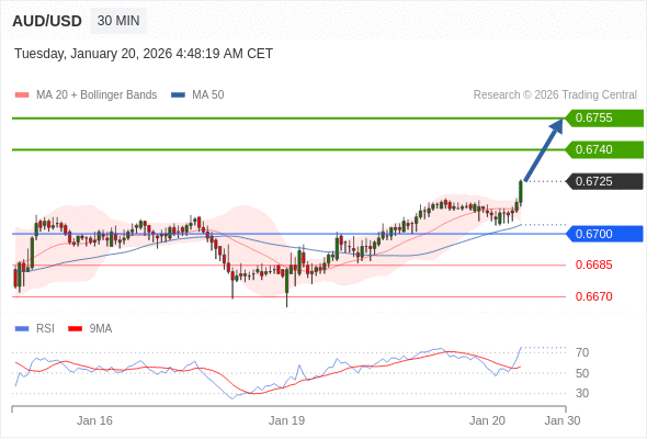 在 0.6700 之上,看涨,目标价位为 0.6740 ,然后为 0.6755 。