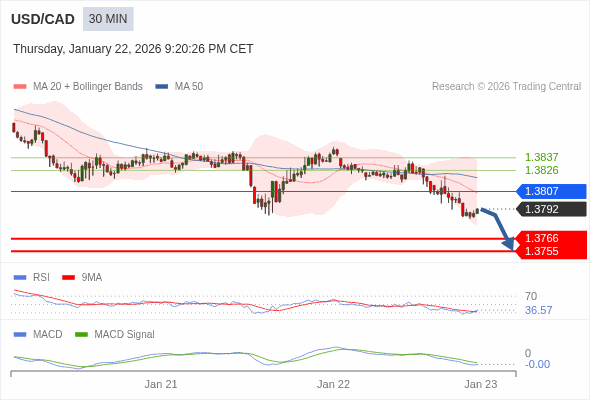 美元/加元 当日内 : 看跌,在 1.3807 之下。