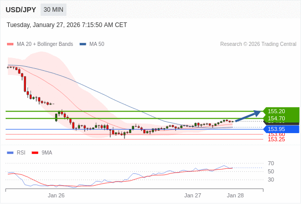 在 153.95 之上,看涨,目标价位为 154.70 ,然后为 155.20 。