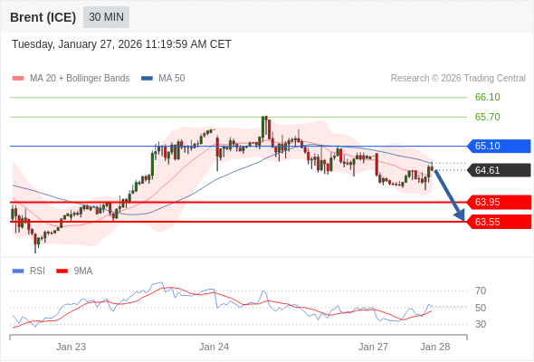 在 65.10 之下,看跌,目标价位为 63.95 ,然后为 63.55 。
