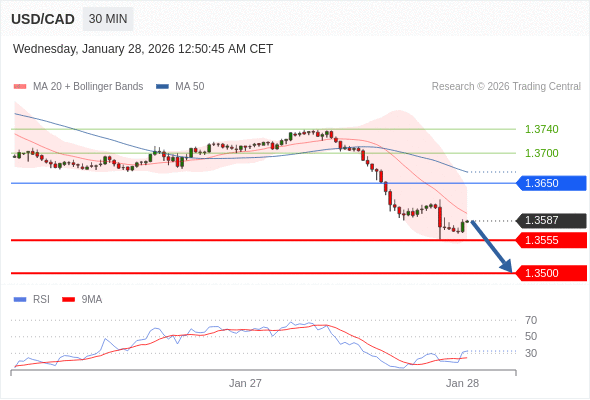 在 1.3650 之下,看跌,目标价位为 1.3555 ,然后为 1.3500 。