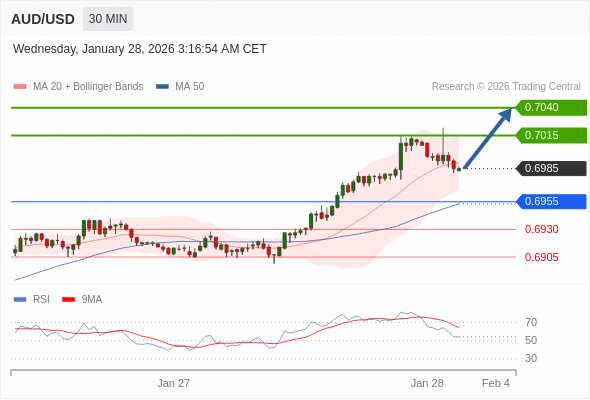 在 0.6955 之上,看涨,目标价位为 0.7015 ,然后为 0.7040 。