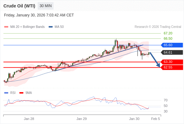 在 65.60 之下,看跌,目标价位为 63.30 ,然后为 62.55 。
