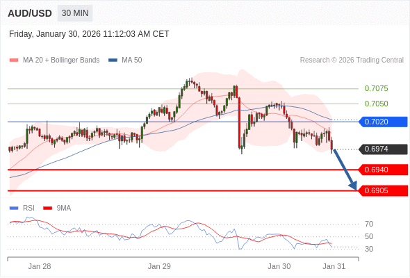 在 0.7020 之下,看跌,目标价位为 0.6940 ,然后为 0.6905 。