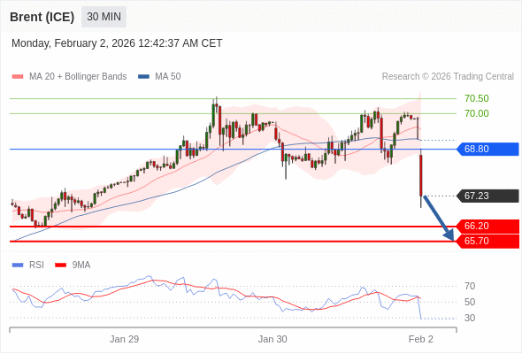 交易策略: 在 68.80 之下,看跌,目标价位为 66.20 ,然后为 65.70 。