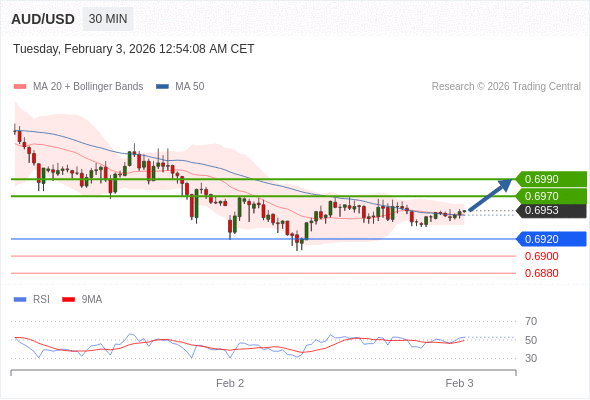 在 0.6920 之上,看涨,目标价位为 0.6970 ,然后为 0.6990 。