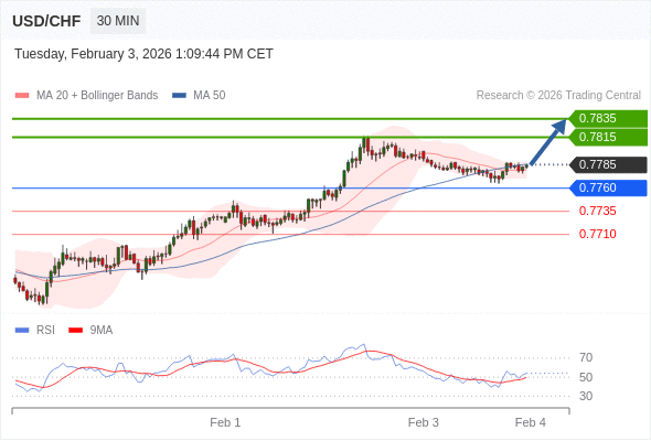 在 0.7760 之上,看涨,目标价位为 0.7815 ,然后为 0.7835 。