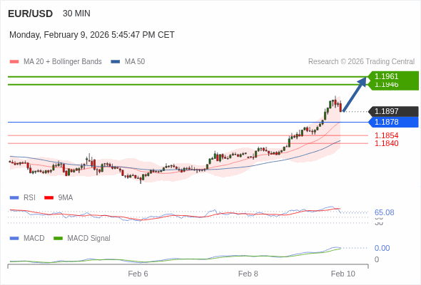 欧元/美元 当日内 : 看涨,当 1.1878 为支撑位。