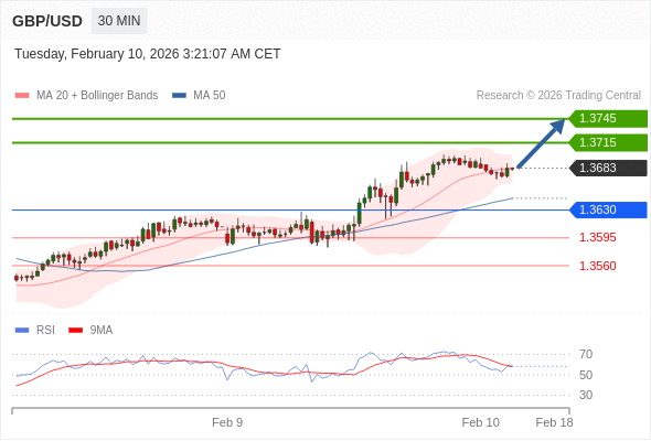 在 1.3630 之上,看涨,目标价位为 1.3715 ,然后为 1.3745 。