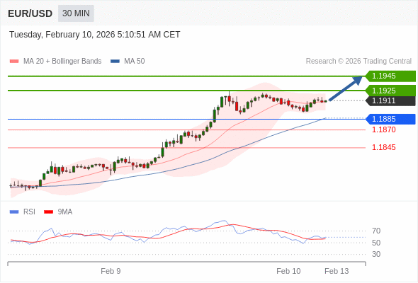在 1.1885 之上,看涨,目标价位为 1.1925 ,然后为 1.1945 。