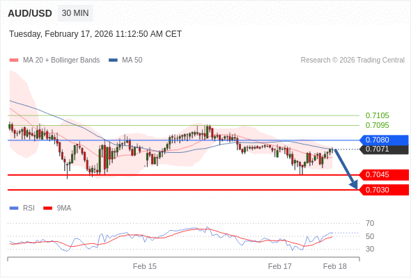 交易策略: 在 0.7080 之下,看跌,目标价位为 0.7045 ,然后为 0.7030 。