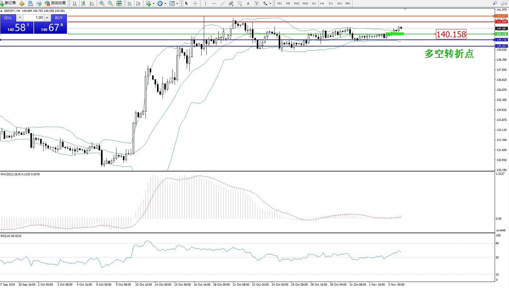 交易策略:140.158上方看涨,目标141.049、141.473