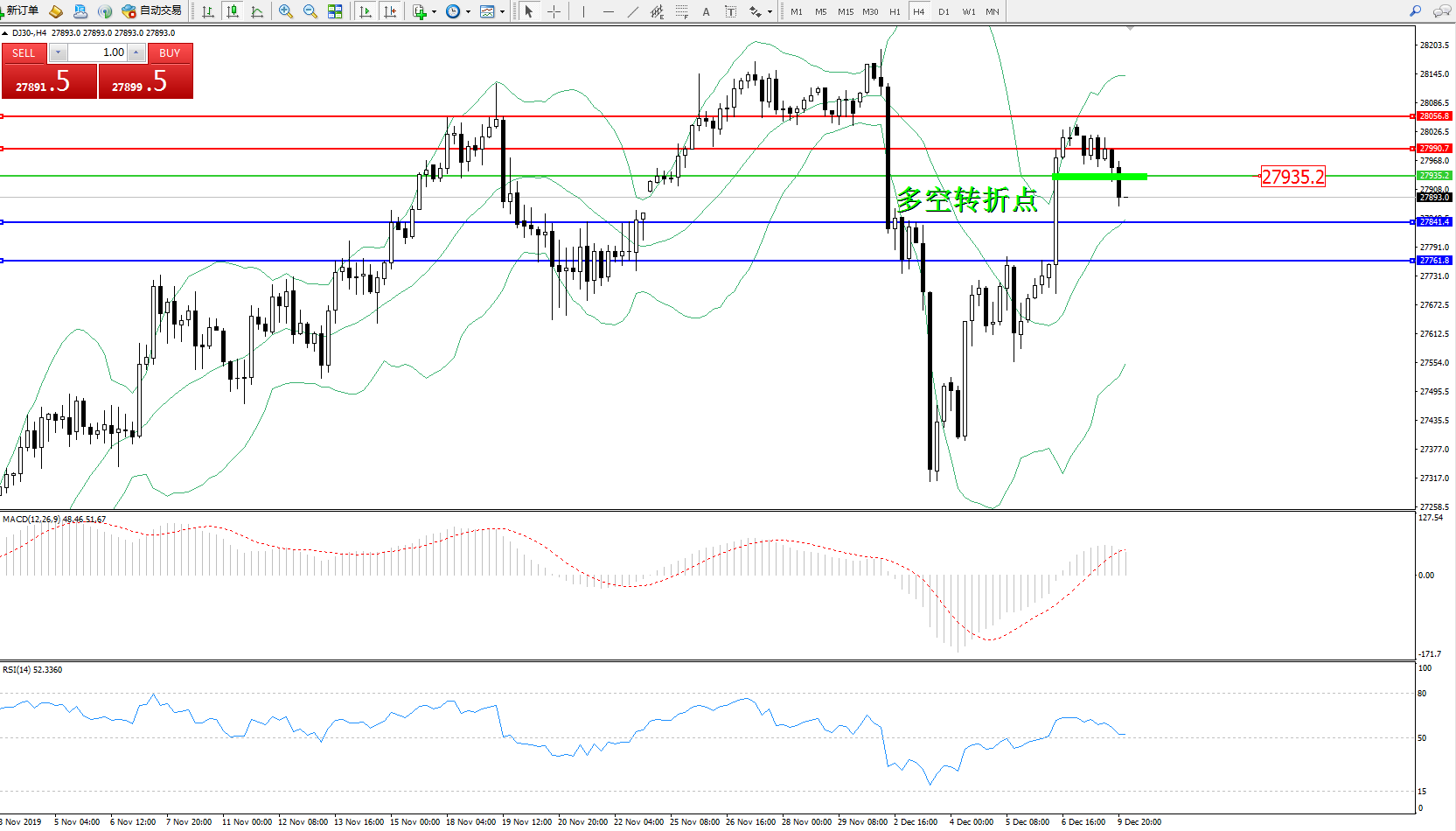 道琼斯指数DJ30—— 4小时K线图显示: