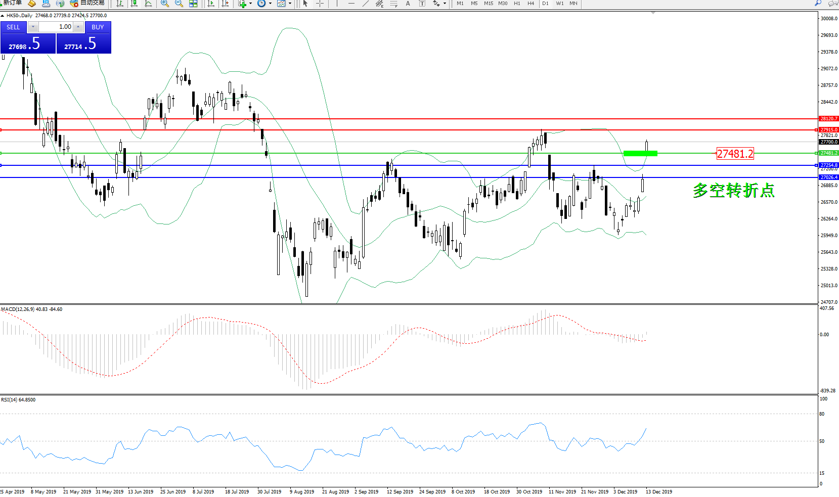 香港恒生指数1213日(周五)跳空上扬,收盘大涨693.62点,涨幅2.57%,报27687.76点;港股各大机构近日陆续发布2020年策略报告,海外市场当前由风险偏好回升驱动的整体反弹持续性有限,行情分化将重新加剧。利率上行将削弱低估值市场吸引力,而高增长市场将受青睐。此前美国总统特朗普发表的关税方面言论,提振了市场乐观情绪,美股三大指数盘初刷新历史新高。