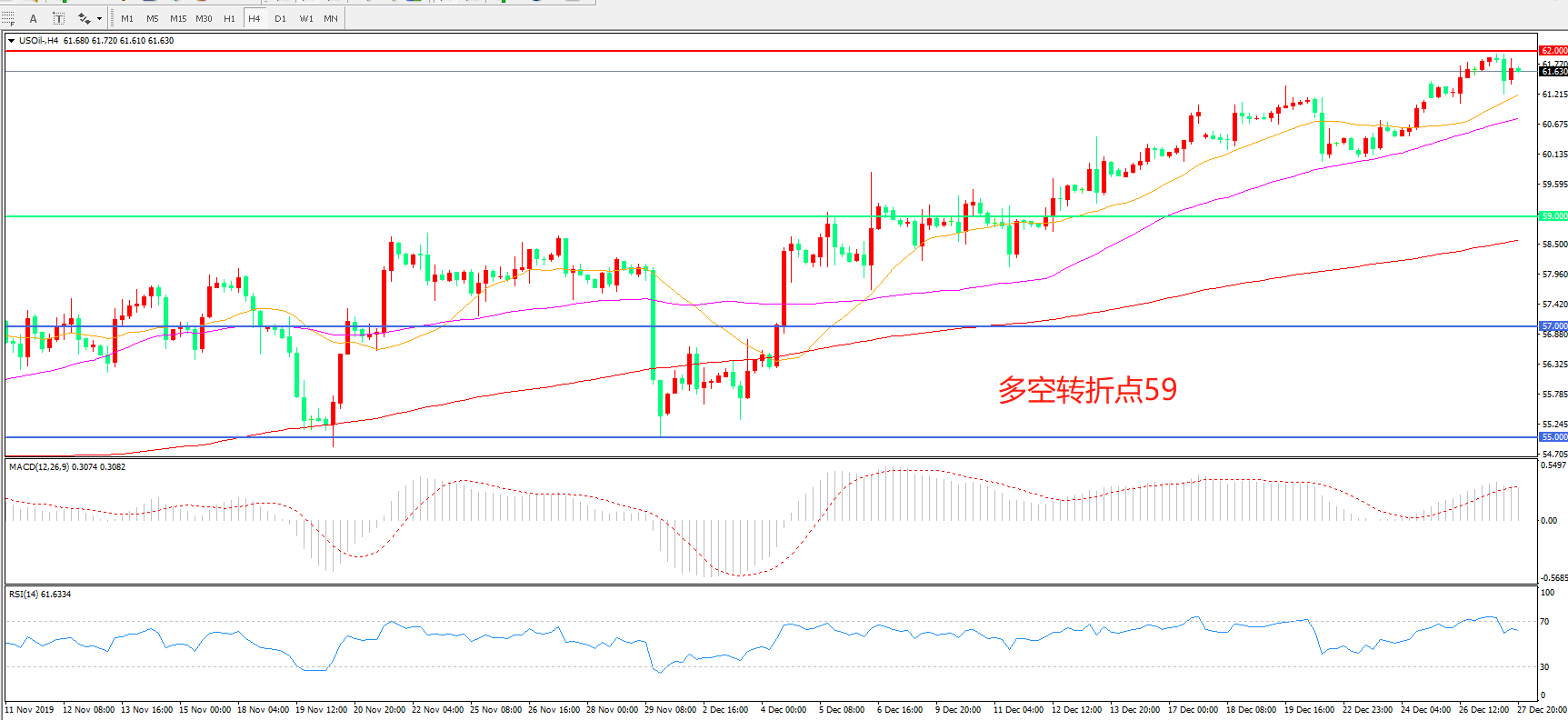 4小时图看,油价呈现高位震荡,62美元一线成为短期阻力,均线系统呈现多头排列,MACD红柱缩短,RSI指标邹平,日内延续上行概率较大。