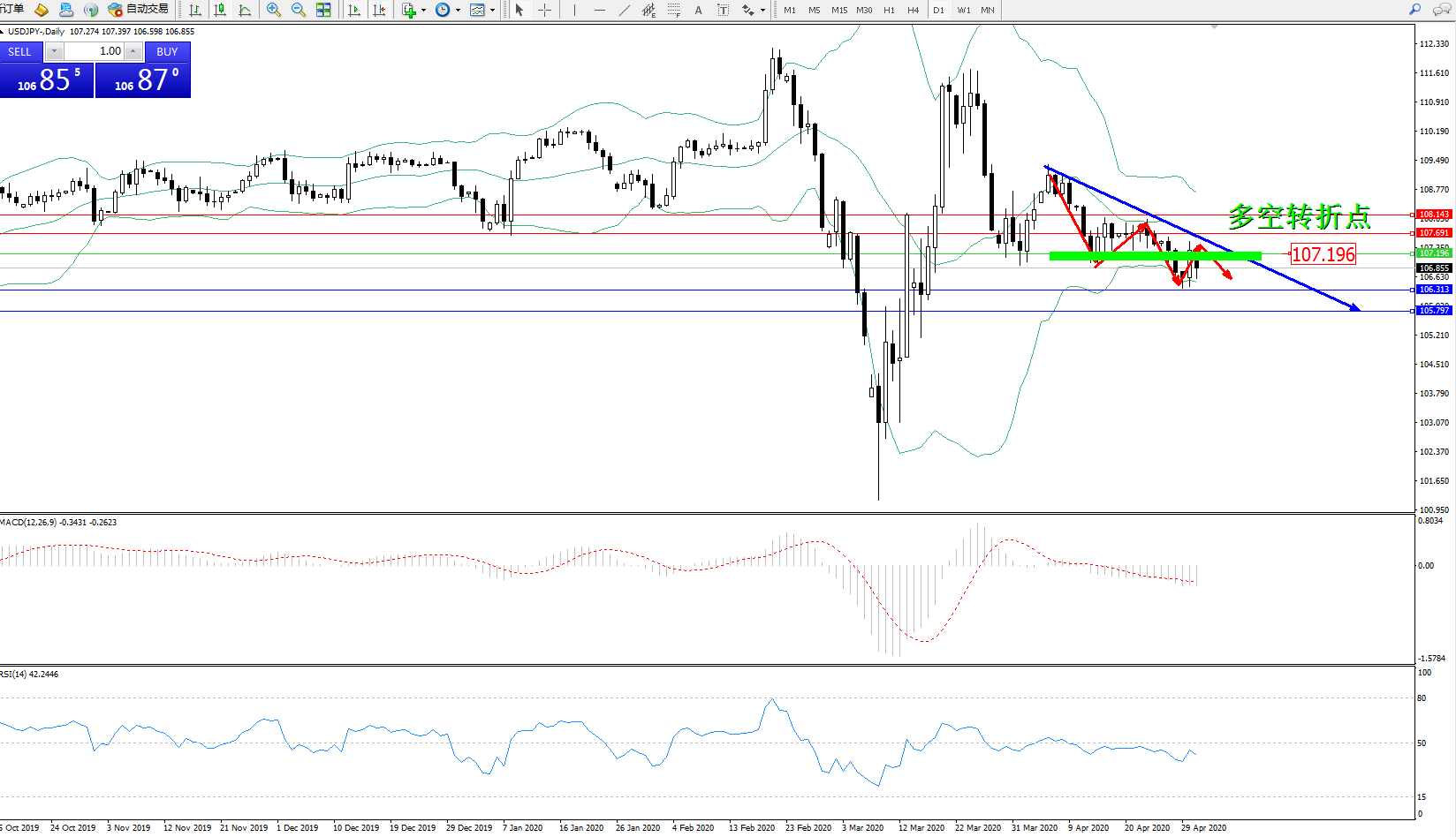 交易策略:107.196下方看跌,目标106.313105.797