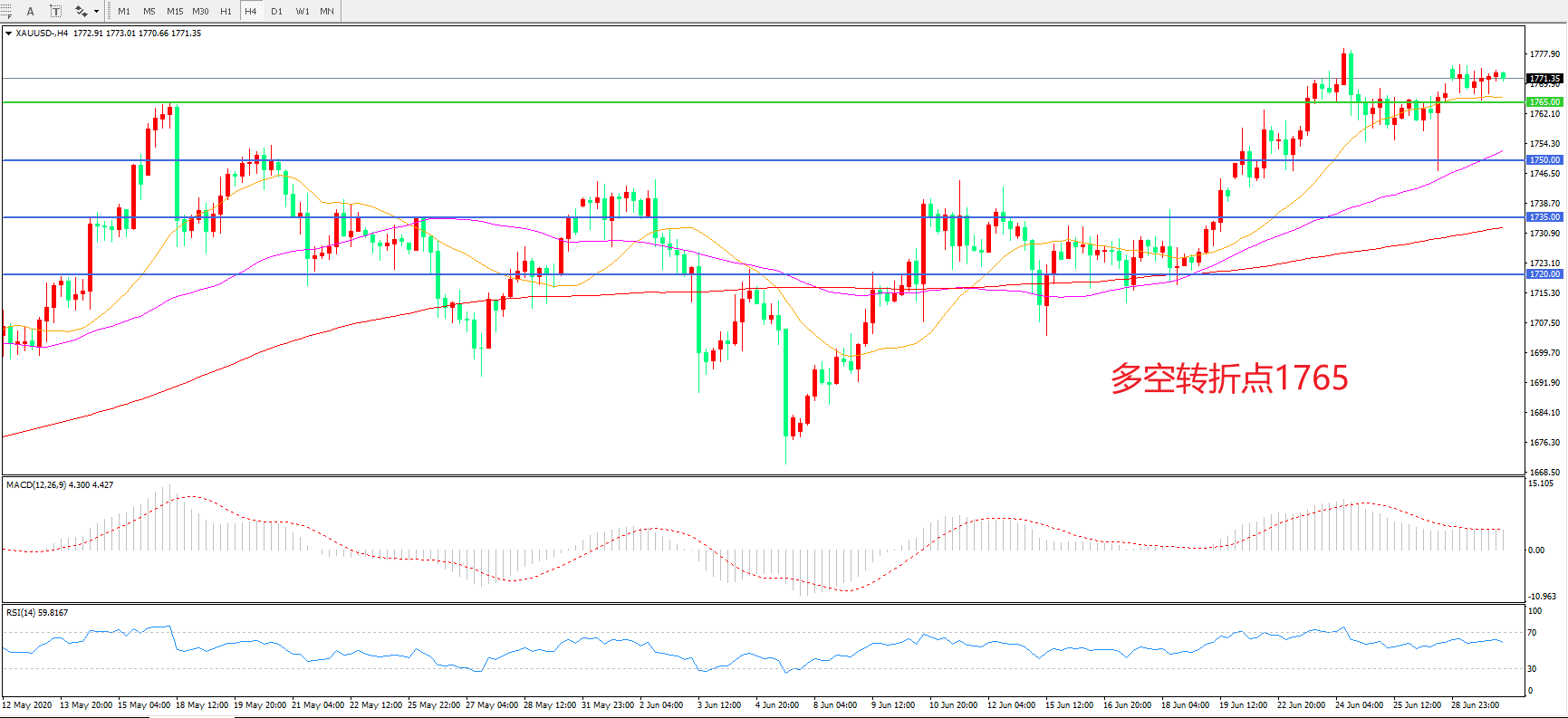 交易策略:在1765.00之上看涨,目标1780.00   1800.00