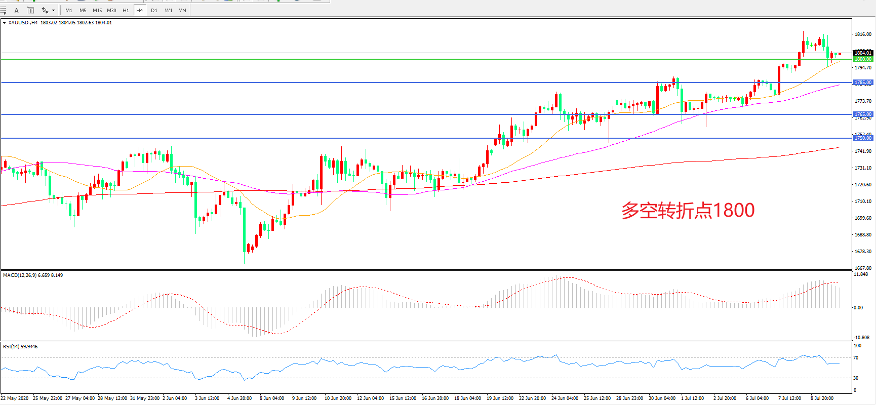 交易策略:在1800.00之上看涨,目标1820.00   1845.00