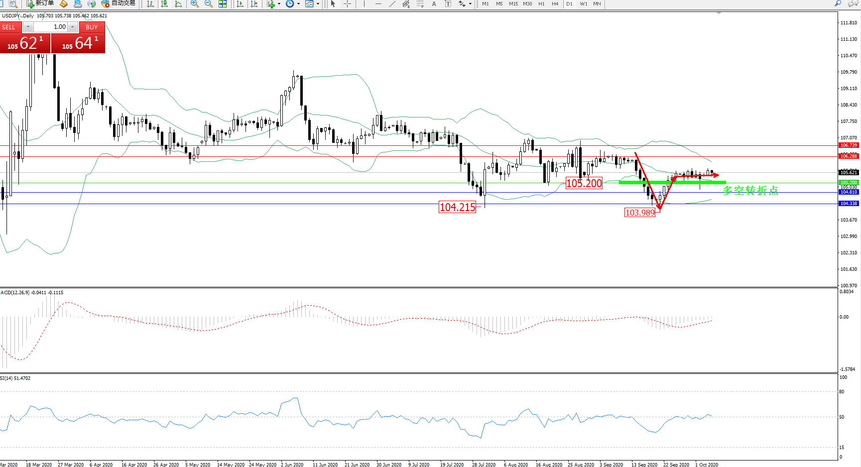 美元兑日元跌0.19%,报105.52。市场对特朗普病情的怀疑依然浓厚,会继续关注后续发展,特朗普准备下周再次跟民主党候选人乔·拜登辩论。另一方面,美国总统特朗普周二叫停了与民主党议员的新冠救助议案谈判,直到大选结束。尽管在流感季节到来之前,美国大部分地区的新冠病毒病例都在上升。围绕美国大选的不确定性依旧带来避险需求。此外全球疫情形势依旧严峻,全球经济仍存停滞风险。预计美国大选将迎来“蓝色浪潮”,即拜登将在大选中获胜,参议院易主。与对全球经济增长的预估一致,我行市场观点仍大体处于顺周期。不过“蓝色浪潮”对美国股指的影响则是喜忧参半。积极的方面是,美国财政政策可能会更加持续性的宽松,贸易紧张局势再度升级的风险降低,以及全球经济增速前景展望更加稳固。消极的方面是,企业所得税将增加大幅增加。预计长期主权债券收益率将得到实质性支撑,并支持我行对大宗商品价格走高和美元走软的长期预测。