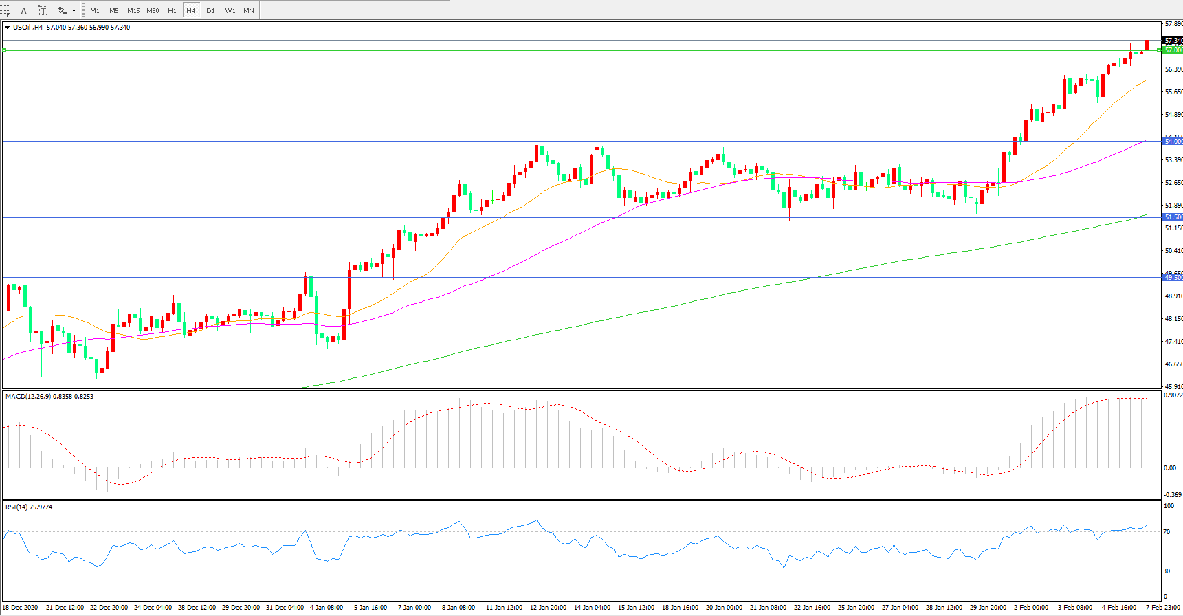 4小时图看,油价连续拉升,整体表现偏强,54阻力被快速突破,多头趋势已经形成,MACD红柱增加,RSI指标向上,日内延续上行概率较大。
