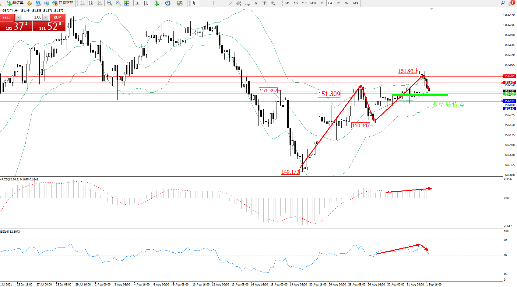 技术点评:多头动力延续布林带指标通道中上轨区间持续震荡上扬,高位抵达151.931位置后遇阻回撤,短期触及布林带指标中轨附近节点附近震荡,布林带指标呈上行趋势走势良好,MACD指标处于0轴线上方持续整理平移,RSI指标处于50均衡线上方多头区域维持震荡后短暂回撤;