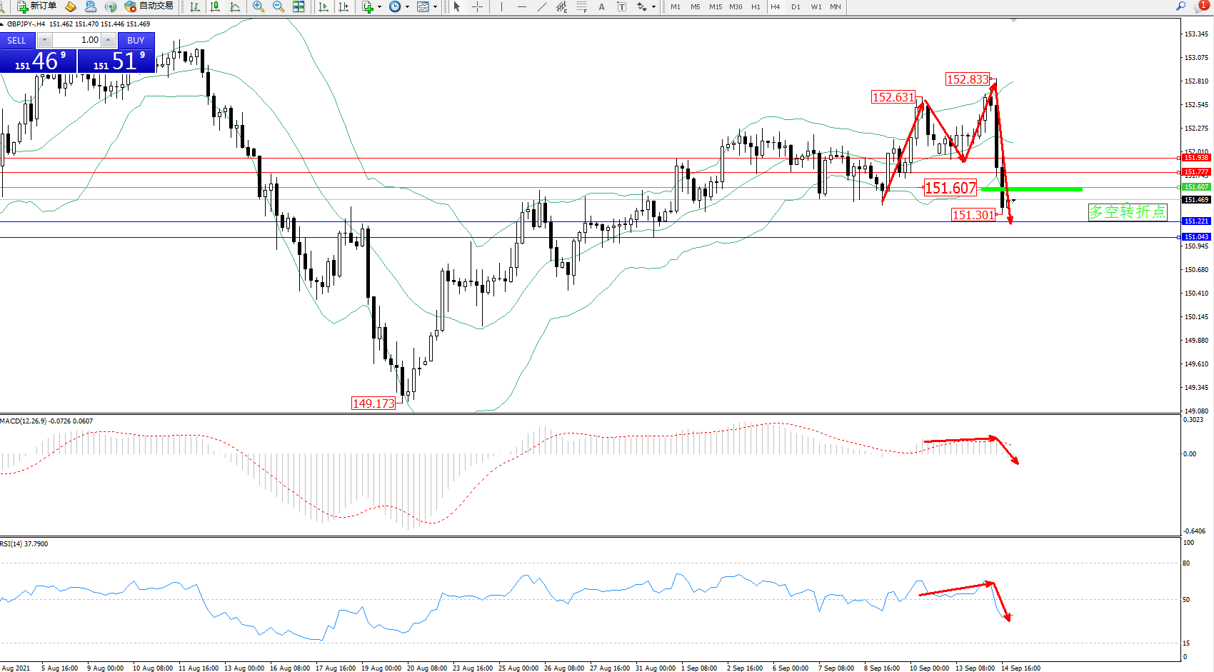交易策略:151.607下方看跌,目标151.221、151.043