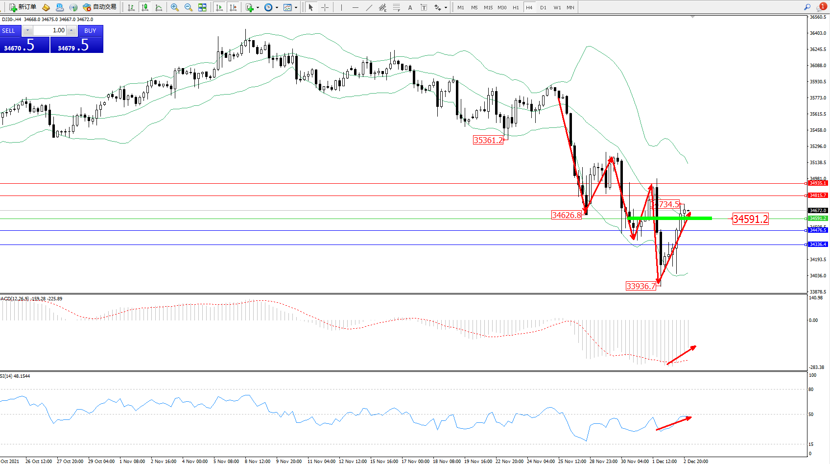 交易策略:34591上方看涨,目标34815、34935