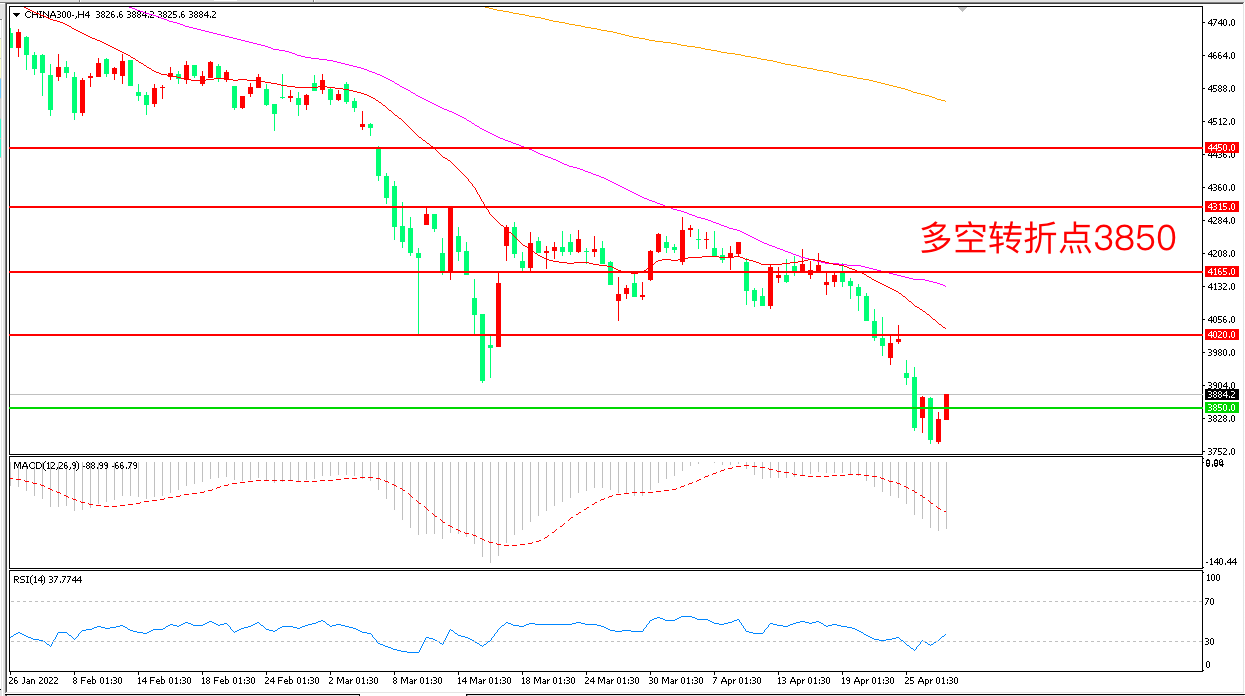 4小时图看,沪深300探底回升,短线走势有所企稳, 但由于前期跌幅过大,整体仍处于空头趋势之中,MACD绿柱增加,RSI指标走平,日内延续震荡概率较大。