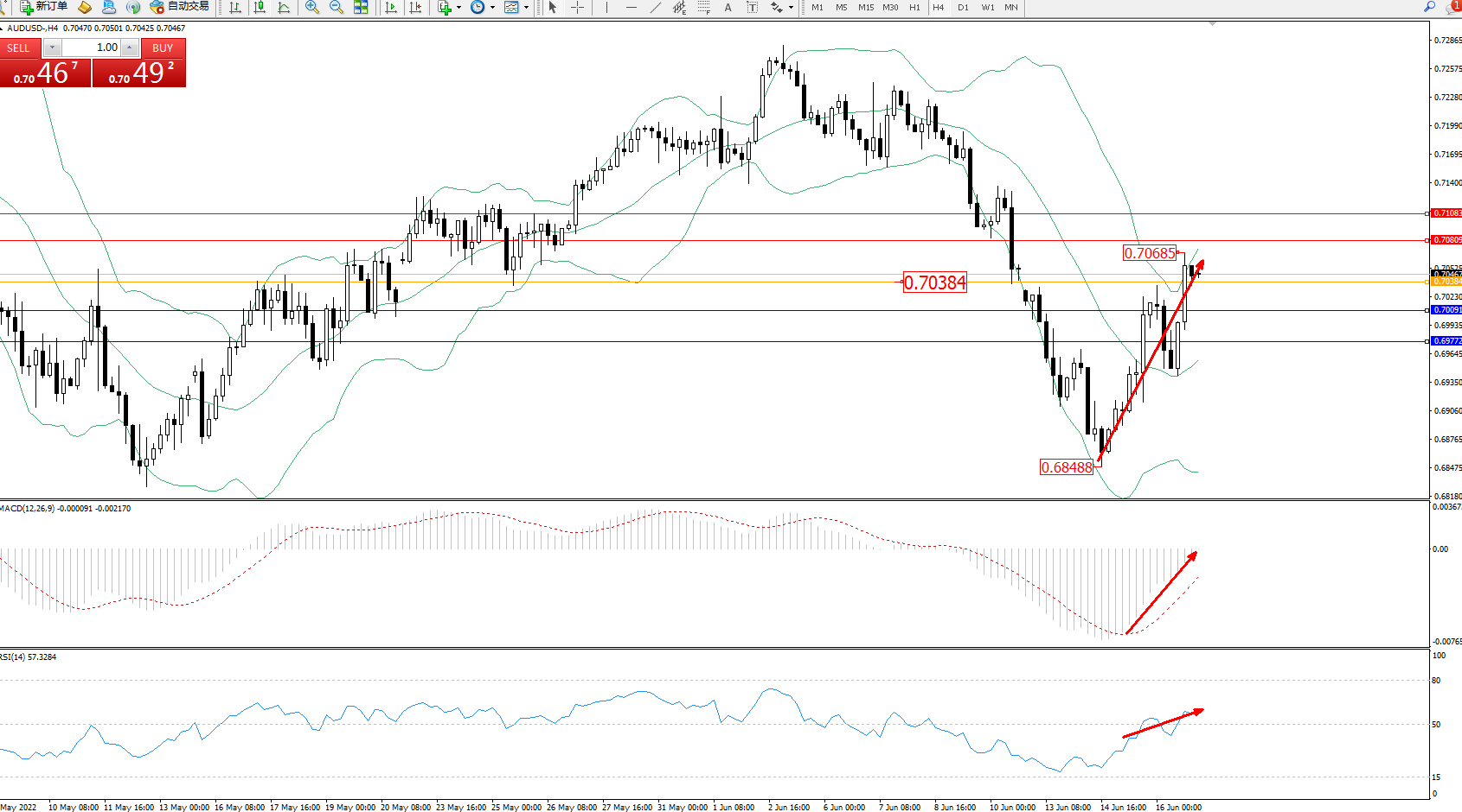 交易策略:在0.70384上方看涨,目标0.70809、0.71083