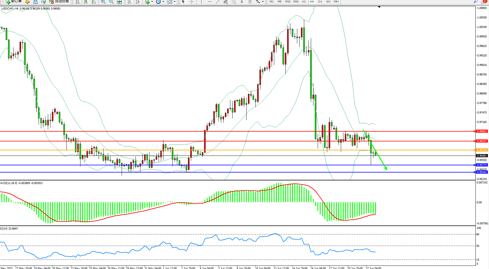 美元瑞郎USDCHF——4小时K线图显示: