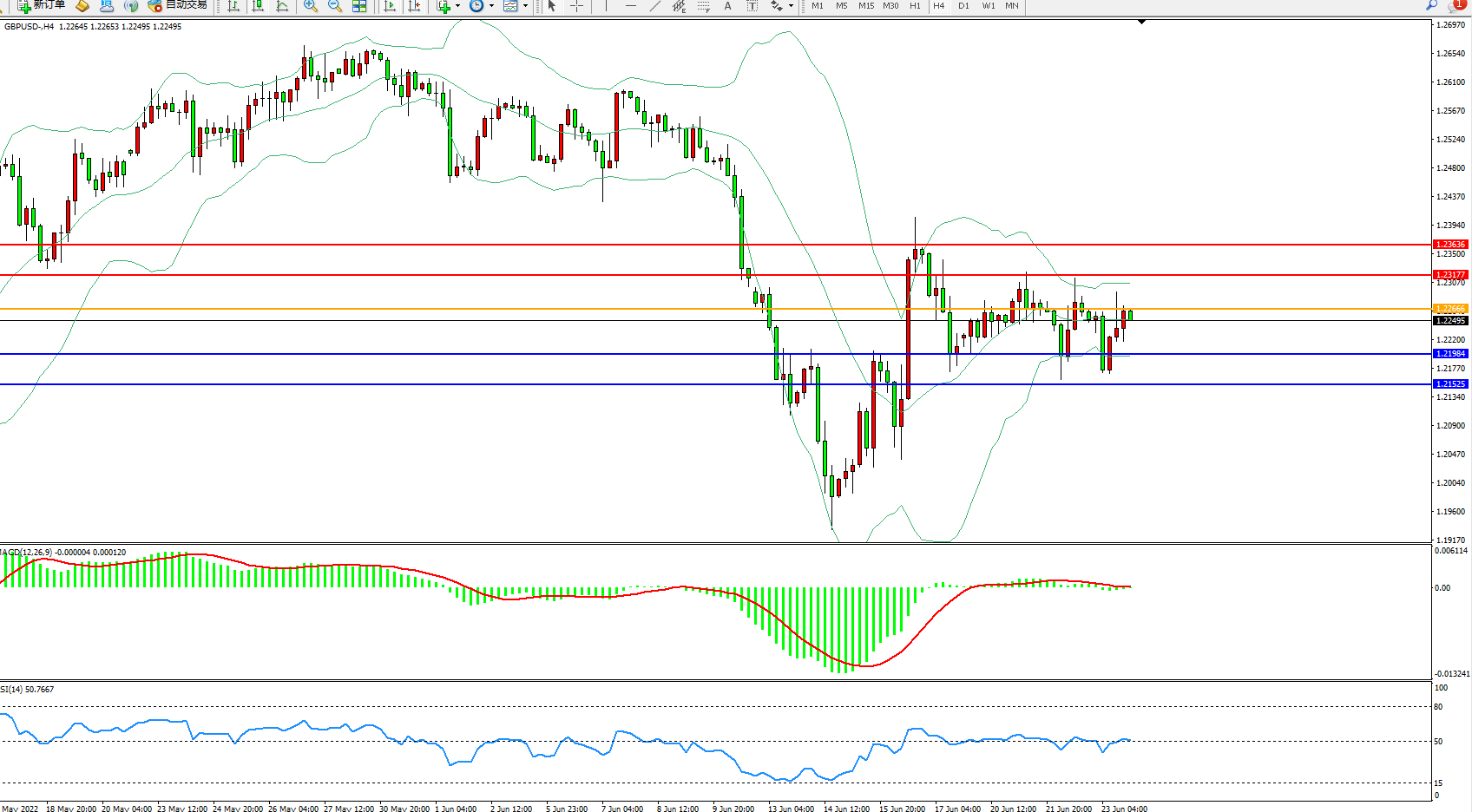 交易策略:1.22666下方看跌,目标1.21984、1.21525