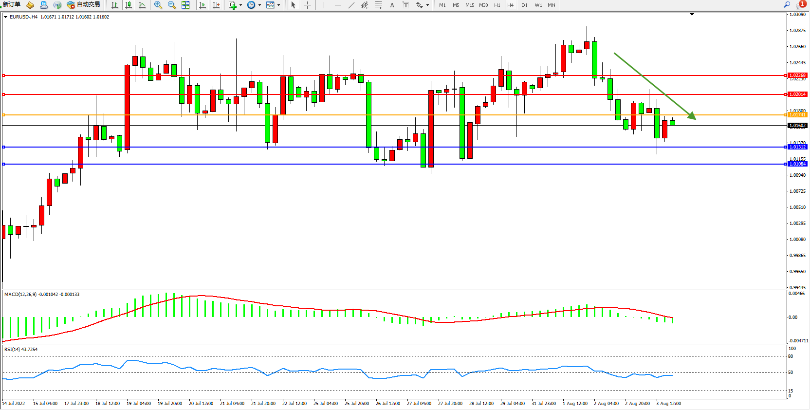 4小时图看:高位空头动力维持震荡缓慢下行,短期空头下行走势或将延续,且尚未有止步迹象,MACD指标处于0轴线下侧弱势徘徊,RSI指标处于50均衡线下侧窄幅整理;