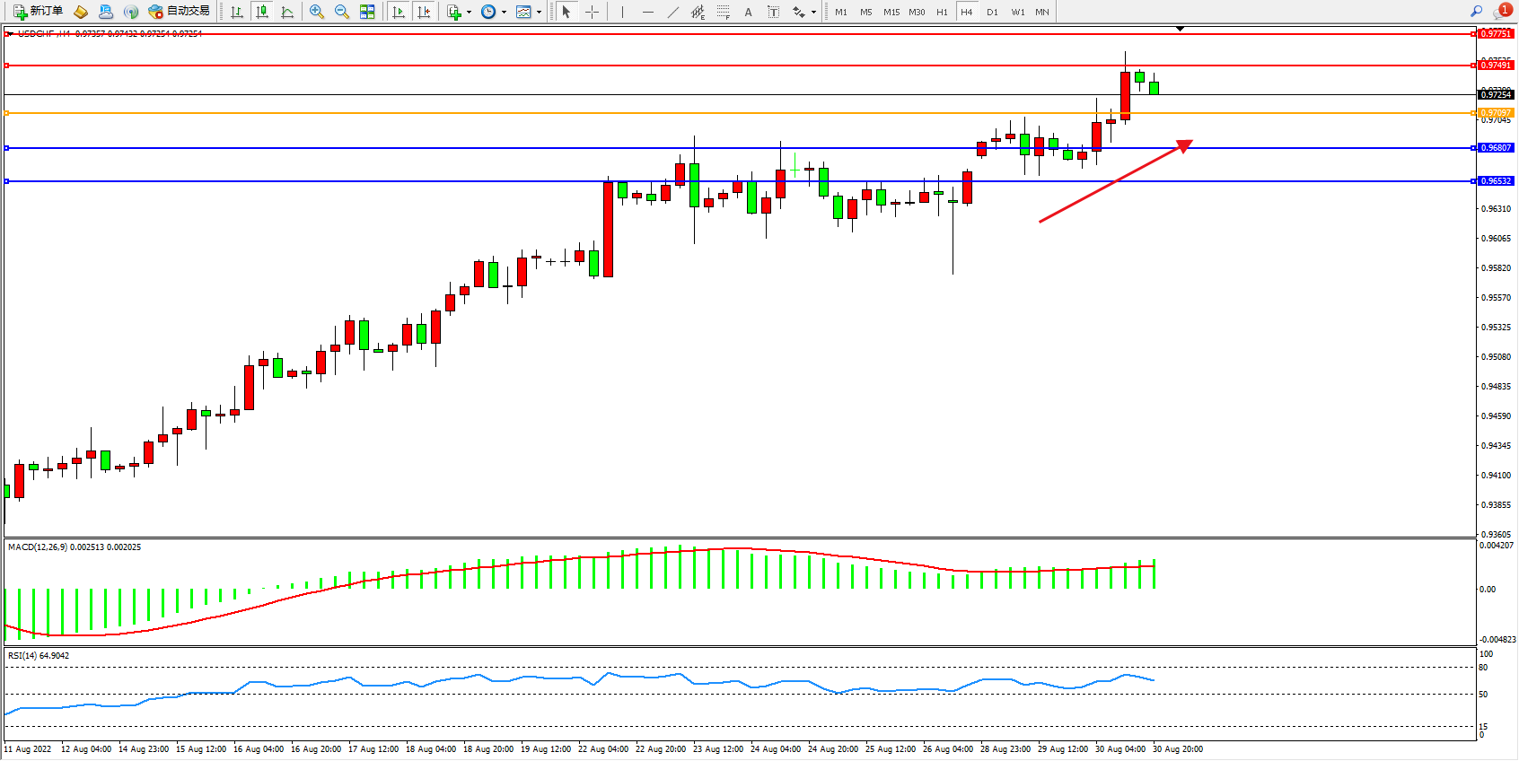 美元瑞郎USDCHF——4小时K线图显示: