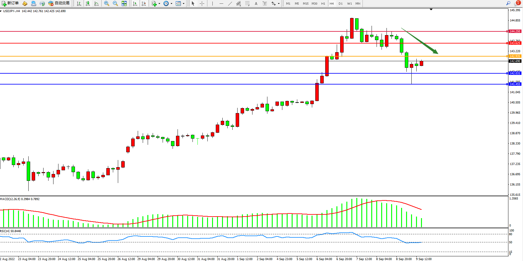 4小时图看:高位空头动力维持震荡下行,短期空头情绪开始涌现,市场跌势或将延续,MACD指标处于多头区域维持整理下移,RSI处于50均衡线附近弱势徘徊;