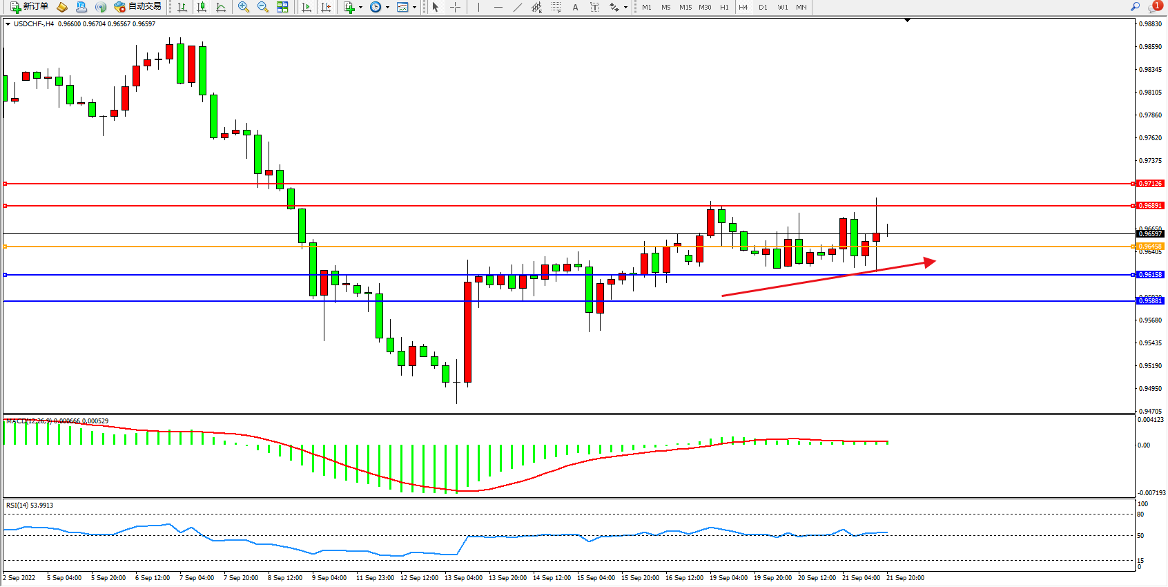 美元瑞郎USDCHF——4小时K线图显示: