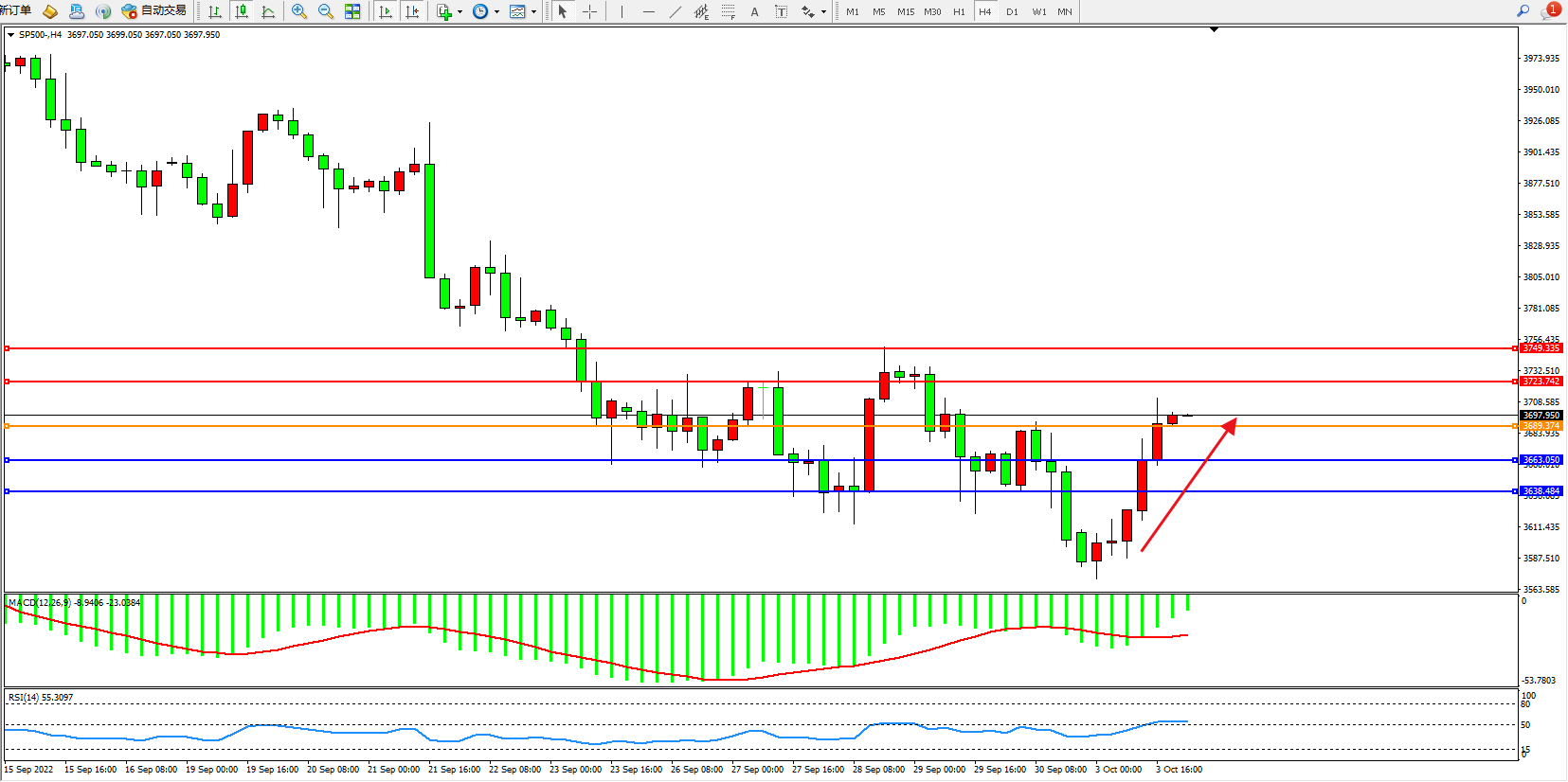 标普SP500——4小时K线图显示: