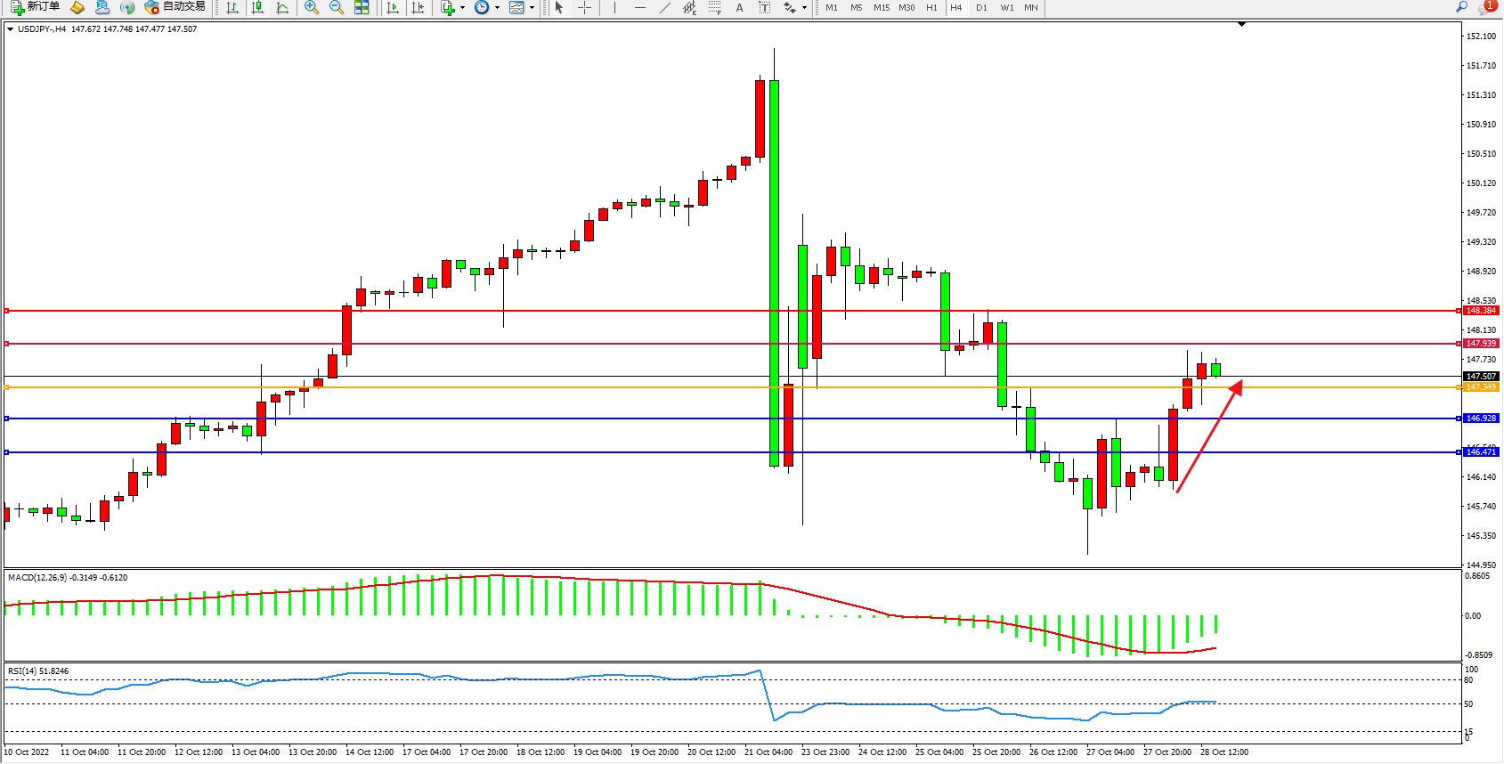 备选策略:147.349下方看跌,目标146.928、146.741