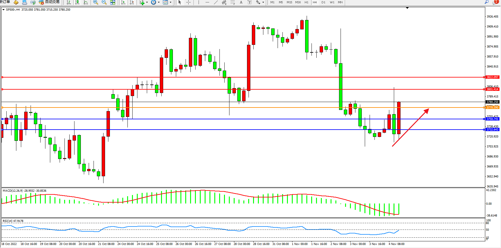 标普SP500——4小时K线图显示:
