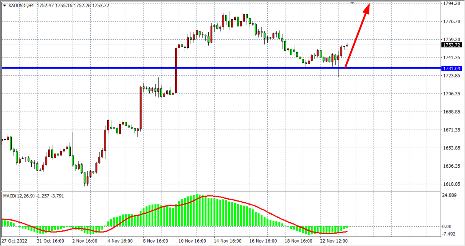 4小时图看,金价回落跌至1731后止跌反弹,支撑被确认,同时MACD于零轴之下呈缩量状态,显示行情走势偏震荡为主,当前支撑位关注1731附近,日内在该位之上看涨为主,上方目标看1765-1785。