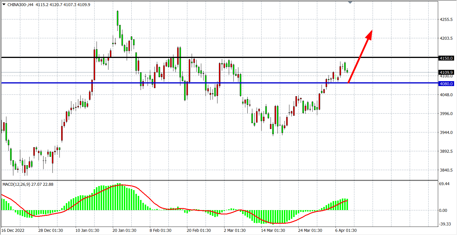 4小时图看,沪深300高位受阻,上方4150压力明显,但MACD仍维持较整齐放量,当前趋势仍向上行,当前支撑关注4080附近,该位之上看4150-4200附近。