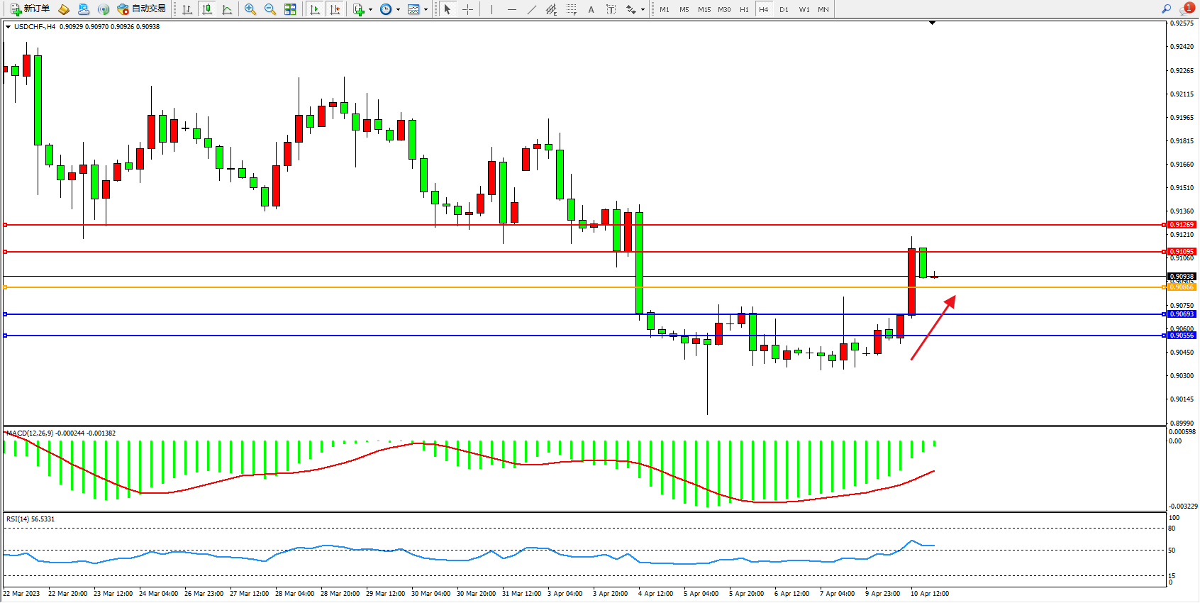 美元瑞郎USDCHF——4小时K线图显示: