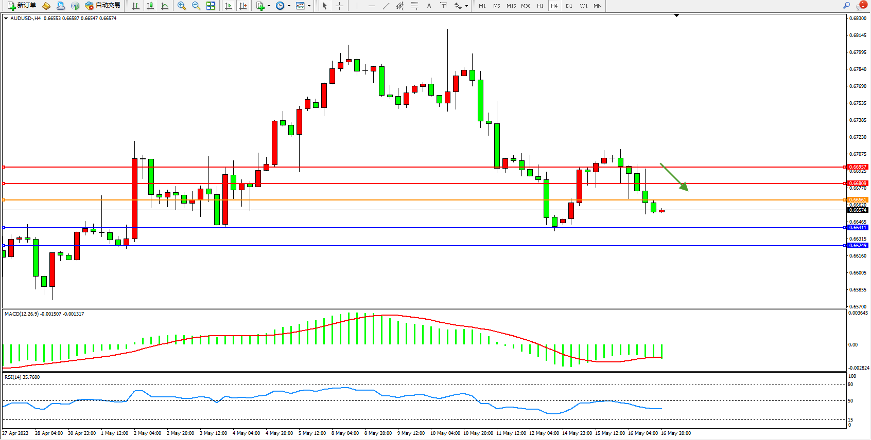 交易策略:0.66661下方看跌,目标0.66411  0.66249