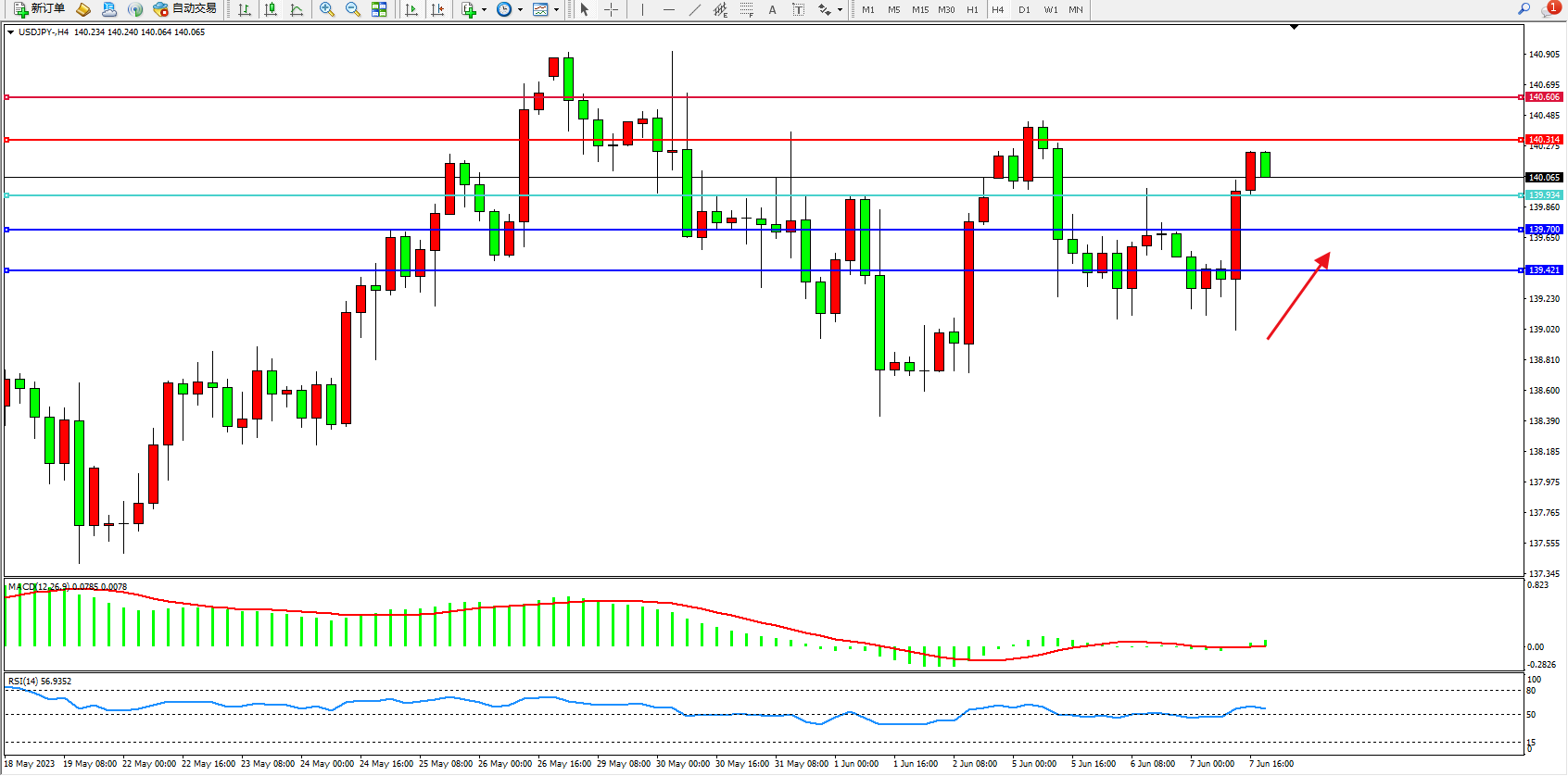4小时图看:短期窄幅震荡后拉升上扬,市场看涨情绪依旧,短期有整理后有继续向上移动迹象,MACD指标处于0轴线附近徘徊,RSI指标处于50均衡线上側弱势整理;