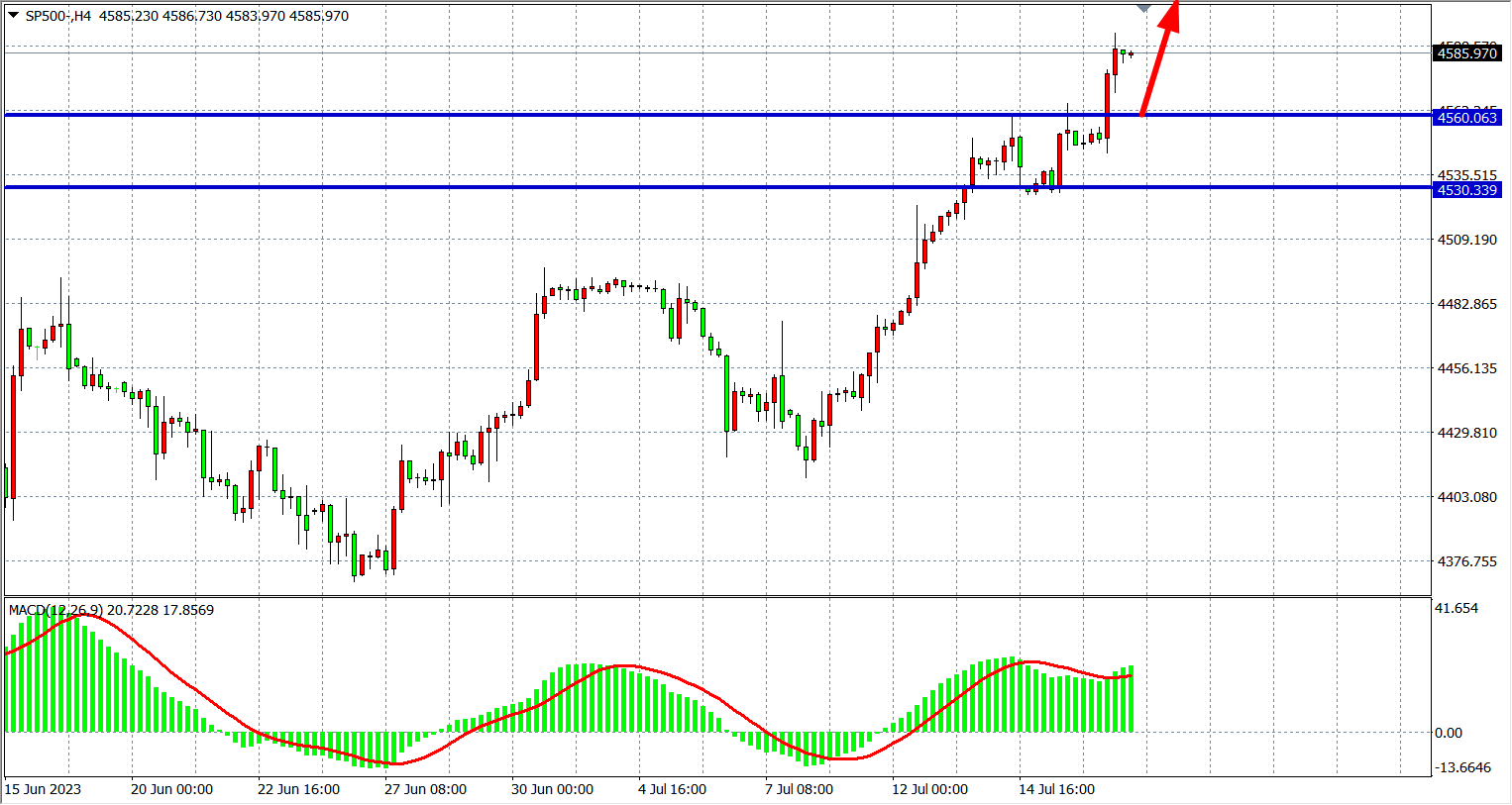 4小时图看,标普继续走高,MACD量能在零轴上持续放量,趋势延续上涨格局不变,当前支撑上移4530-4560附近,上方阻力4600-4640。