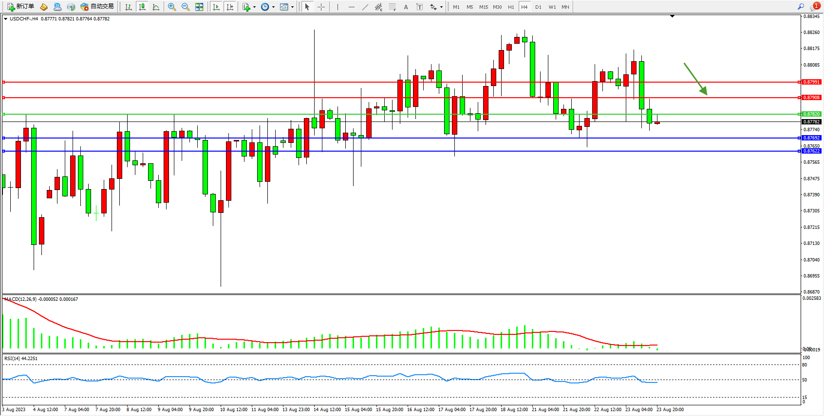 美元瑞郎USDCHF——4小时K线图显示:
