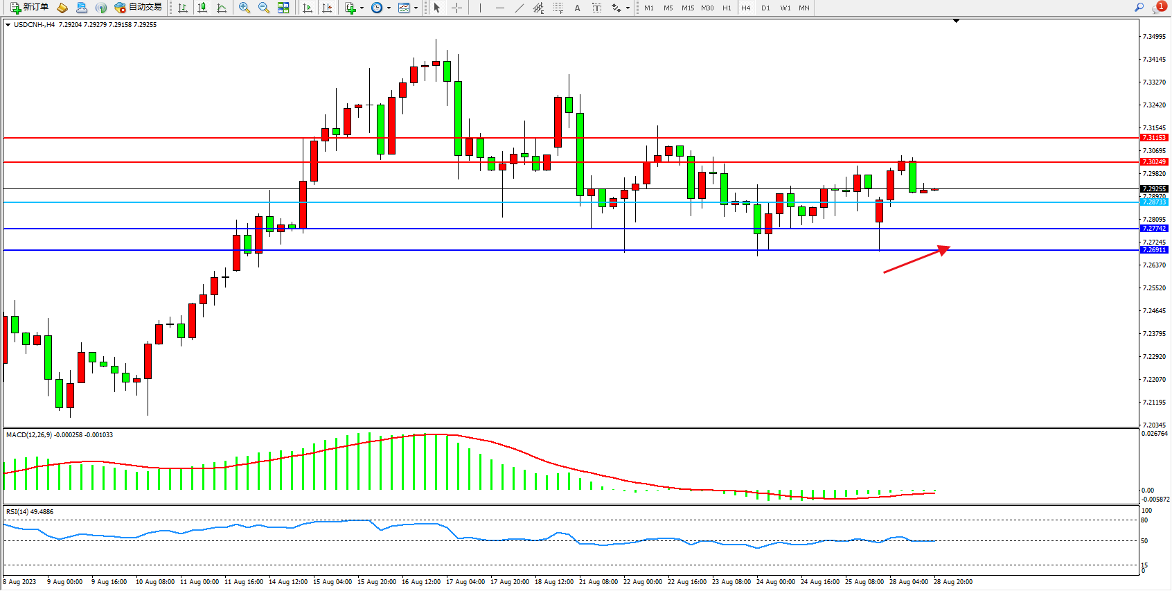 交易策略:7.28733上方看涨,目标7.30249  7.31151