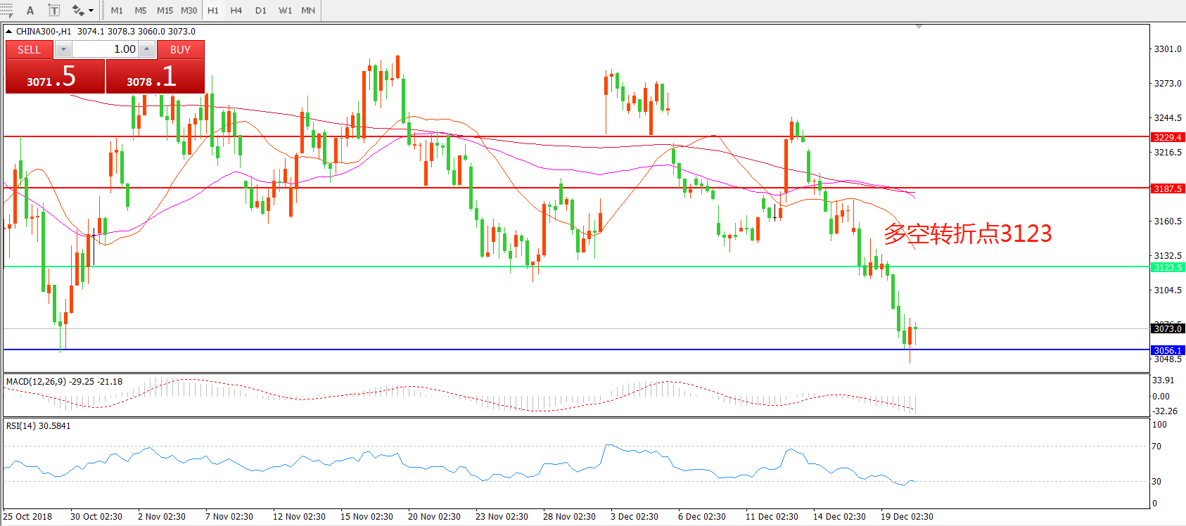 1小时图看,CHINA300中华指数走势依旧疲弱,均线系统呈空头排列, MAC绿柱增加,RSI持续下行,短线依然存在下探的可能性。