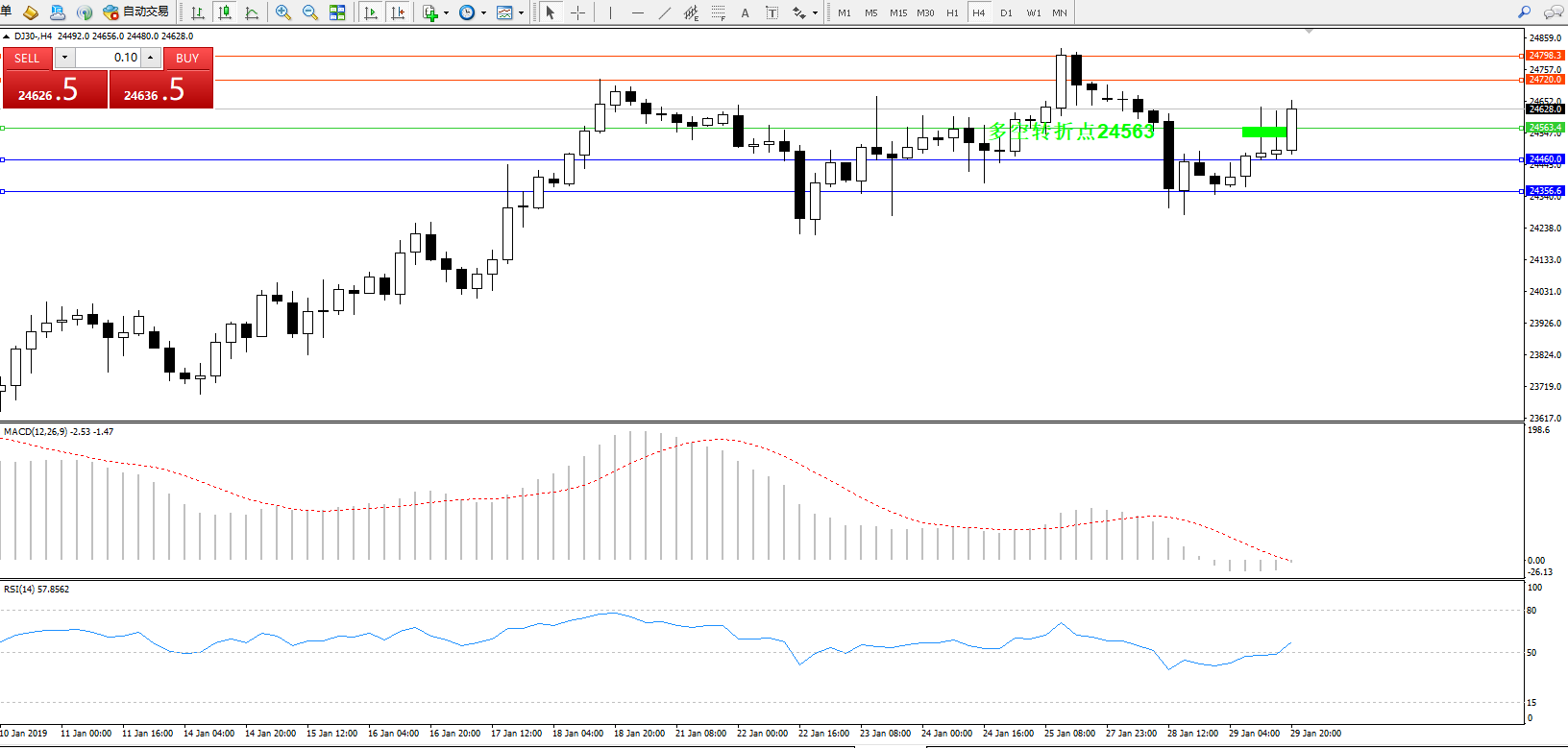 道琼斯指数DJ30—— 4小时K线图显示: